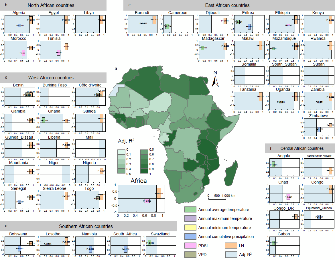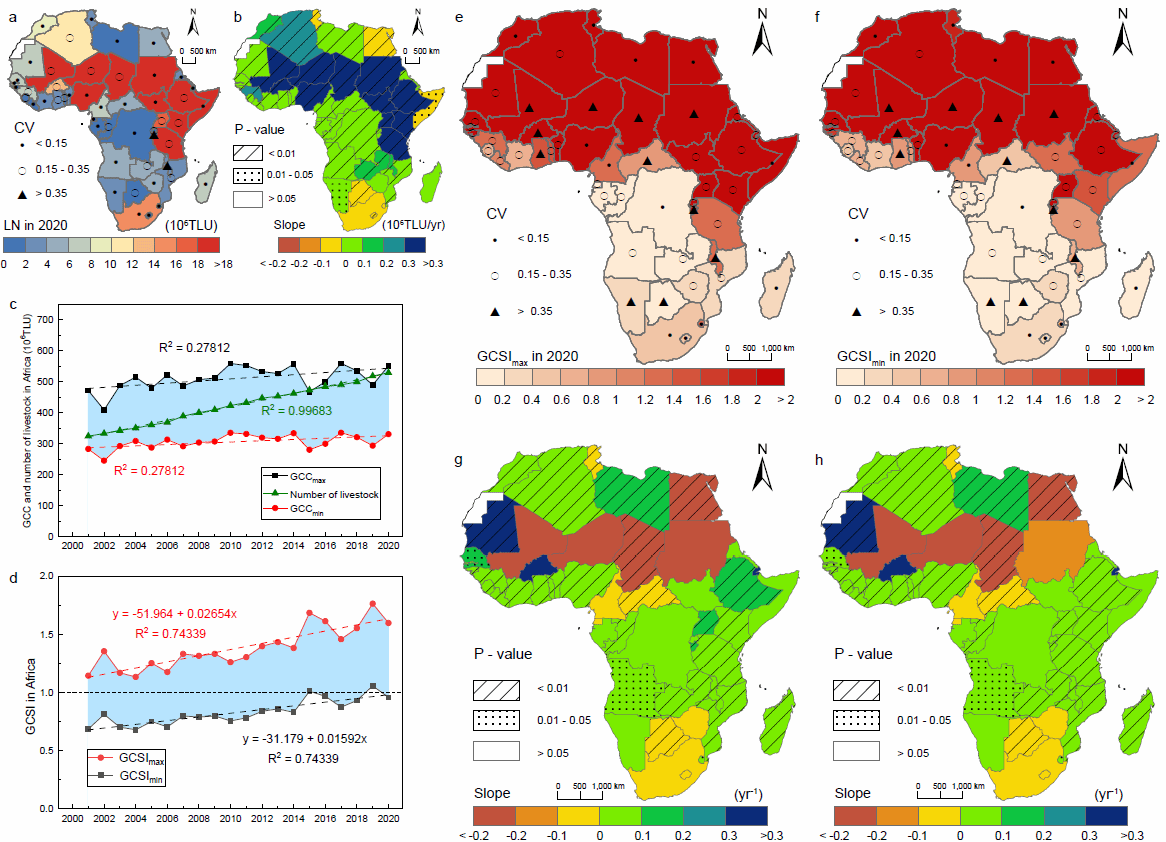 通过驱动力分析显示,气候因素和牲畜数量对非洲草地承载力状况(GCSI)的综合贡献率为80.4%,北非和东非对影响因素表现出更强的反应。