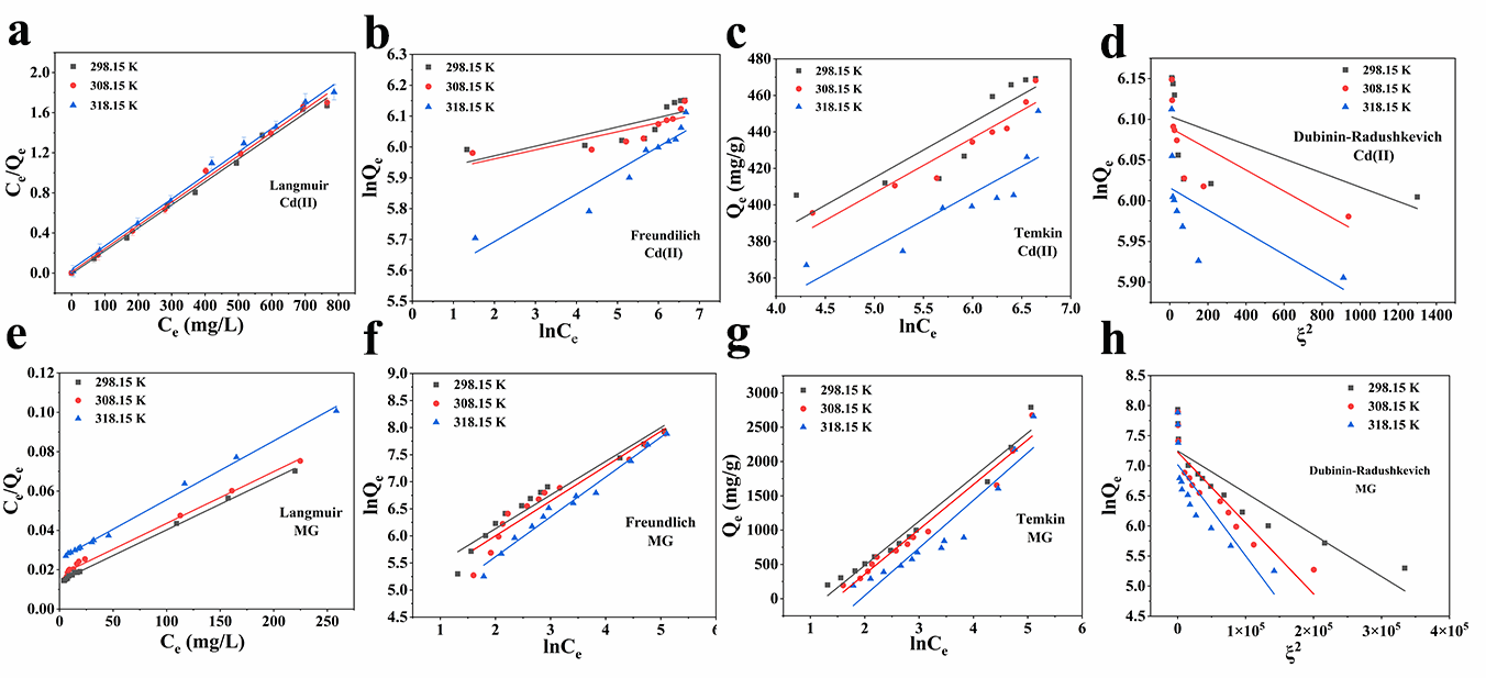 图4. E-MPNS对Cd(II)(a、b、c和d)和MG(e、f、g和h)的吸附等温线模型的线性拟合。