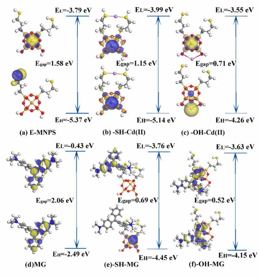 图6. E-MPNS的LUMO和HOMO图(a),-SH-Cd(b),-OH-Cd(c),MG(d),-SH-MG(e)和-OH-MG(f)。