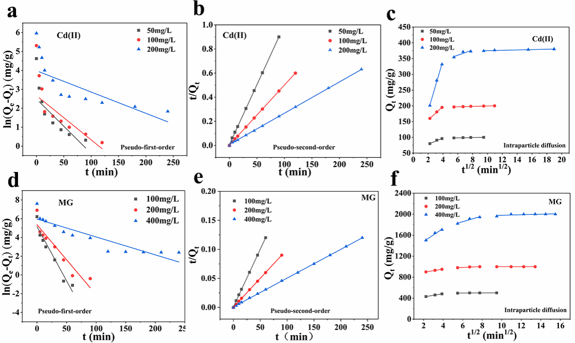 图3. E-MPNS对Cd(II)(a、b和c)和MG(d、e和f)的吸附动力学模型的线性拟合。