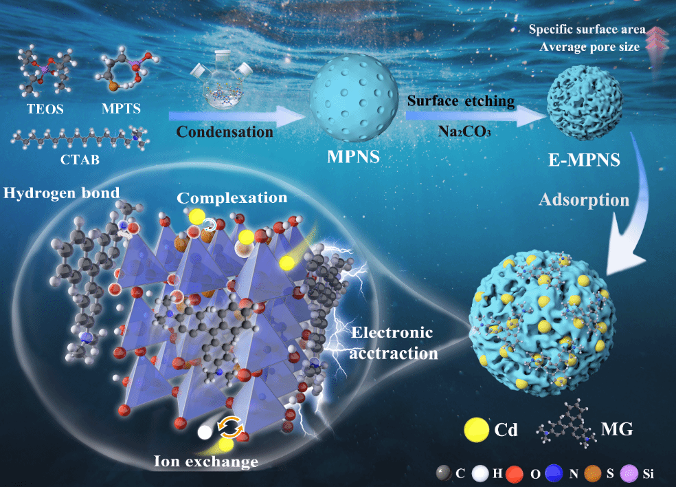 废水中有毒重金属和染料的共污染对生态系统和人类健康构成严重威胁,然而能够同时高效去除重金属和染料的吸附剂仍然有限。因此,研究团队通过缩合法和选择性液相刻蚀法制备了一种新型的表面蚀刻巯基功能化多孔纳米二氧化硅微球(E-MPNS),用于同时高效去除废水中的Cd(II)和孔雀石绿(MG)(图1)。