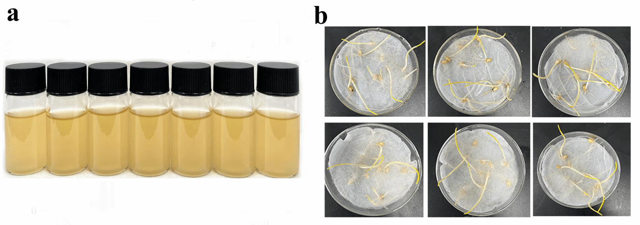 图7. 24小时后培养的大肠杆菌的数码照片(a)和用不同浓度的E-MPNS处理的小麦种子的发芽照片(b)。