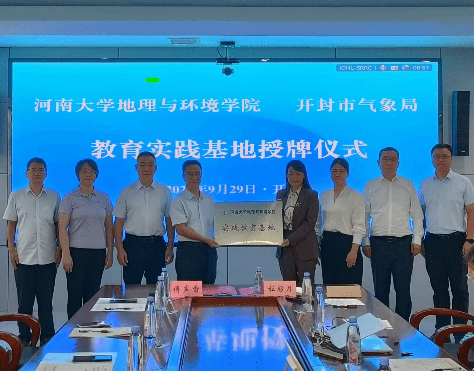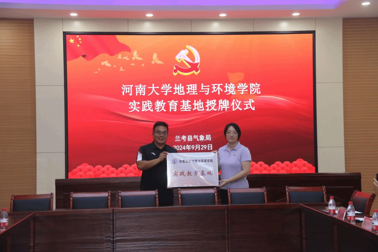 在随后的座谈会上,王新伟向学院领导和教师介绍了兰考县气象局的工作任务和成果,并表达了与学院进行实践教育合作的期待。最后,谷蕾作为学院代表向兰考县气象局颁发“实践教育基地”牌匾,标志着双方合作关系的正式确立。