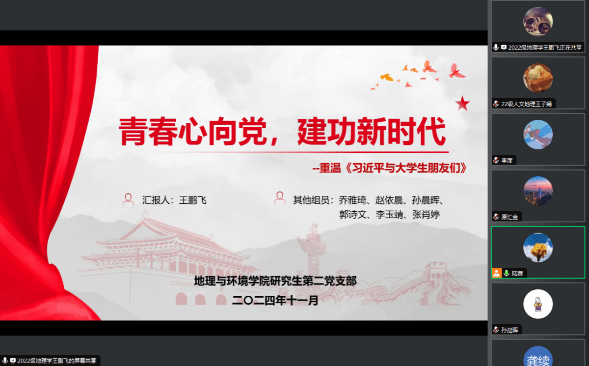 为深入学习贯彻习近平新时代中国特色社会主义思想,进一步引导广大青年党员坚定理想信念,明确新时代的历史使命,11月21日下午,研究生第二党支部开展以“青春心向党,建功新时代”为主题的党日活动,共同学习了《习近平与大学生朋友们》。活动由支部书记陆蓉主持,支部全体党员和发展对象参与活动。