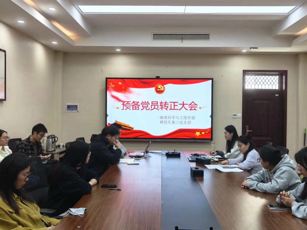为进一步加强党员队伍建设,不断增强党组织的生机与活力,3月26日,我院研究生第三党支部在地学楼301会议室召开预备党员转正大会。会议由支部书记刘方主持,支部全体党员参加。