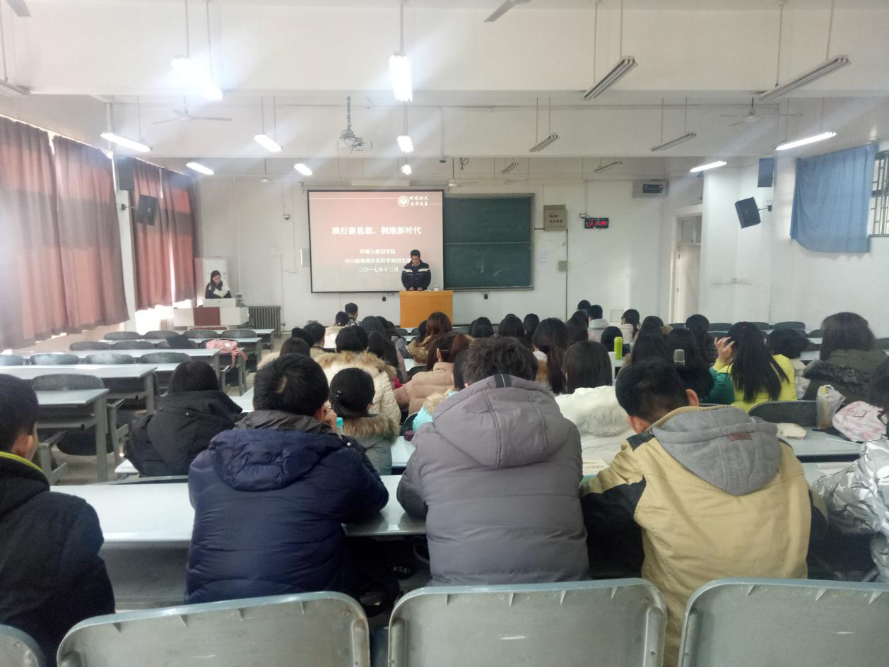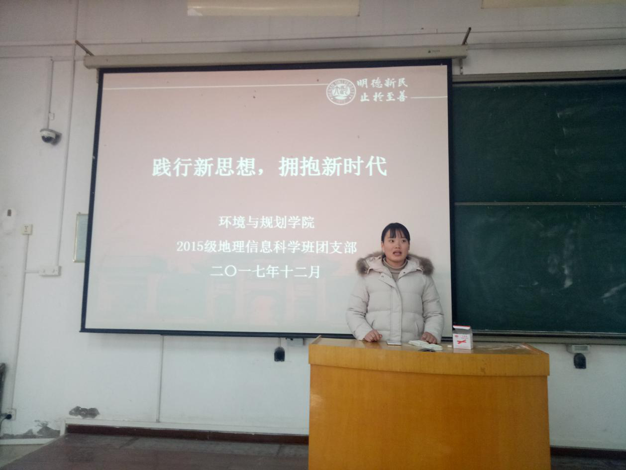 2017年12月21日,环境与规划学院2015级地信班“践行新思想·拥抱新时代”组织生活会在金明综合楼2201教室成功举行。2015级辅导员韩晓静出席本次活动。活动由团支书李倩楠主持。