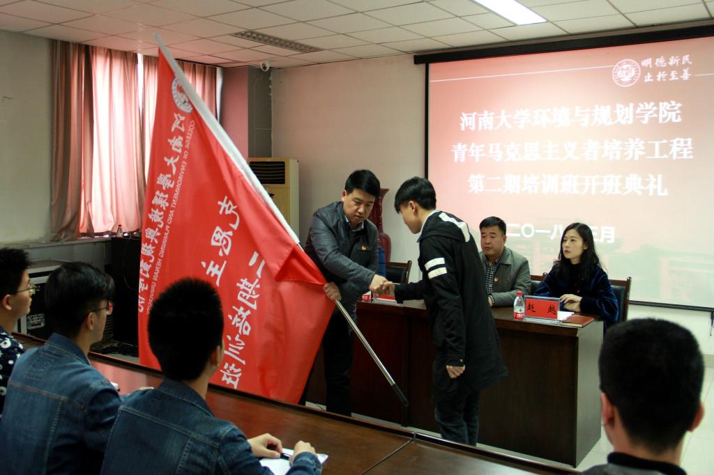 校团委书记翟新礼为本期“青马工程”培训班学员代表授旗。