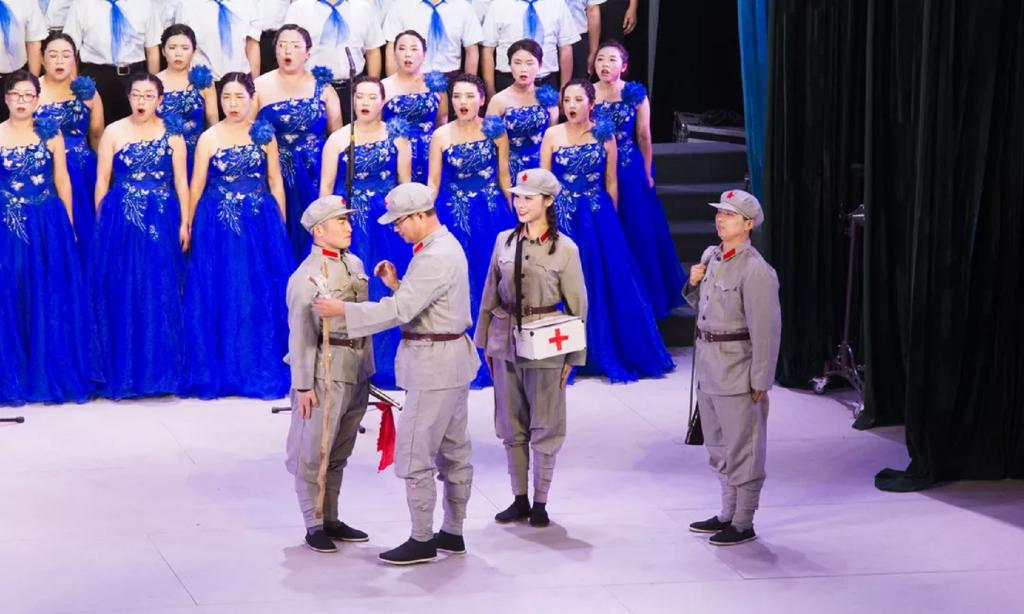 我院教职工上妆扮相,精神抖擞、气宇轩昂。“西风烈”,炸雷响,先声夺人;“从头越”,气势雄,余音婉转。一曲《忆秦娥·娄山关》再现了红军战士征战娄山关,突破重围,浴火重生的艰苦历程。歌声时而慷慨激昂,铿锵有力,时而低回婉转,深沉悲壮,在傅声雷院长的指挥下更显波澜壮阔。一曲唱罢,号角声再起,“东方红,太阳升,中国出了个毛泽东”,男声部浑厚凝重,女声部细腻婉转,嘹亮的歌声、深情的朗诵和动人的情景演绎让听者在曲中聆听历史的回声,感受气壮山河的交响。最后一个音符落下,观众席掌声雷动。