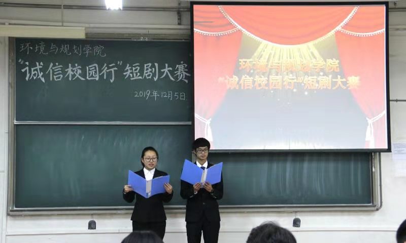 为培养学生诚实守信、知恩感恩、自立自强的优秀品质,12月5日下午,环境与规划学院在金明综合楼4101举办了以“诚信筑未来,奋进新时代”为主题的“诚信校园行”短剧大赛。