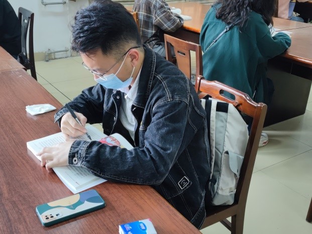 早上八点,同学们在图书馆门口集合,一同前往阅览室,大家以《习近平新时代中国特色社会主义思想学习问答》为主要书目展开学习。该书以问答的形式全面系统、深入浅出的阐述了习近平新时代中国特色社会主义思想的重大意义、科学体系、丰富内涵和实践要求。大家在阅读中重温党史、感悟初心,偌大的阅览室里只听见翻动书页的声音。随后支委带领各小组展开交流,大家围绕自己所读章节畅谈学习感悟,深切感受到党的历史和国家发展、人民幸福休戚与共,纷纷表示应坚定理想和信念,加强党性修养,以更加饱满的热情和昂扬的斗志向百年党史献礼。