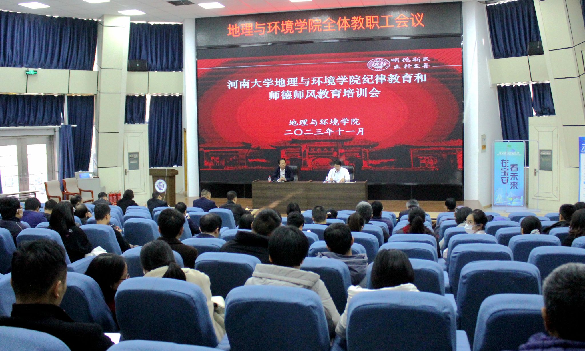 师德,是教师之根;师风,是教育之魂。为进一步加强师德师风建设,引导我院教师坚守教育初心,践行育人使命,推进学院高质量发展,11月23日下午,地理与环境学院在金明校区锥形报告厅召开师德师风建设专题教育大会,学院班子成员及全体教师参加会议。