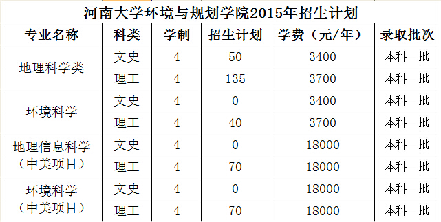 2015年该院按照专业类招生。地理科学类包括地理科学、自然地理与资源环境、人文地理与城乡规划和地理信息科学四个专业;环境科学与工程类包括环境科学专业。学生入学一年后,根据学生志愿和成绩考核按照类别分专业培养。