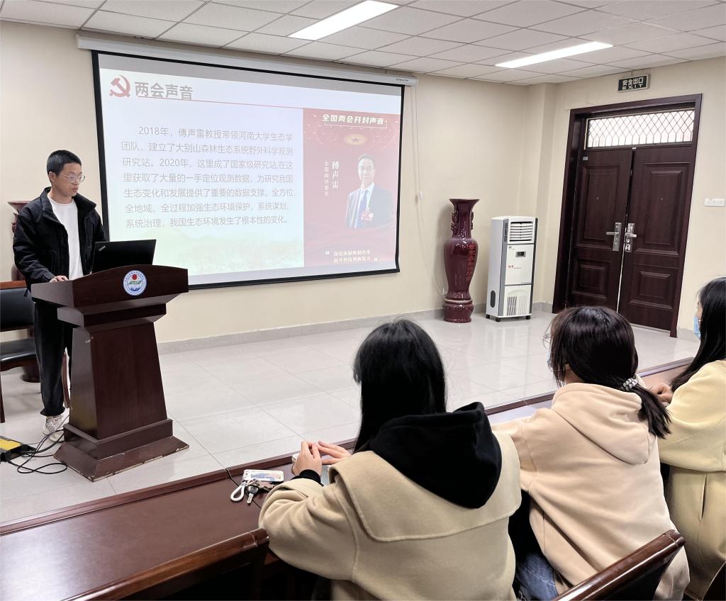 为深入学习宣传贯彻习近平总书记在“两会”期间的重要讲话精神和全国“两会”精神,以高质量党建引领发展,3月25日,研究生第二党支部于学院二楼报告厅开展“学习‘两会’精神,践行青春担当”主题党日活动,会议由支部书记陆蓉主持。